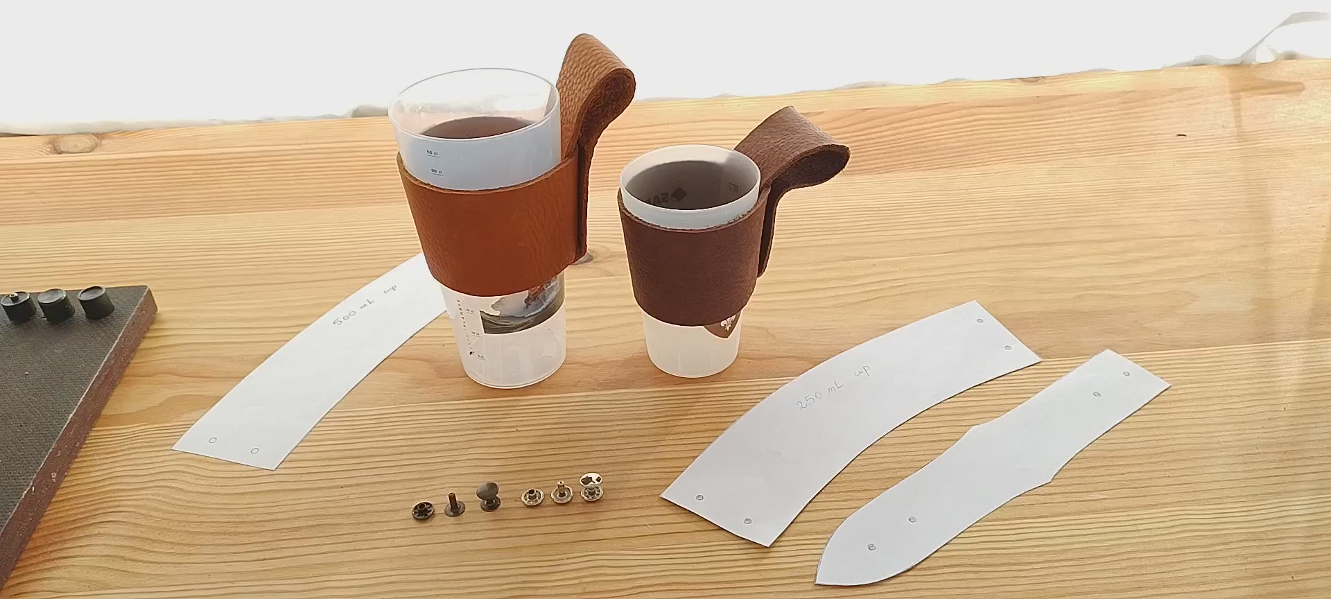Tools needed: leather, marker, scissors, hole punch, tall rivets (4 layers of leather overlapping), and tools for setting up the rivet. Rivets could be replaced by snap buttons or Chicago screws.
